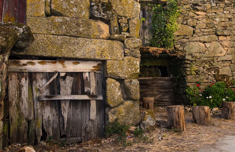 Old, almost dilapidated but still inhabited stone house in a small village in Galicia, northern Spain. Dog lying in the shade in front of it in the midday sun.