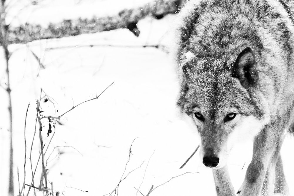 cold forest.. beast hunting sniffs prey. Gray wolf female in the snow, beautiful strong animal in winter. black and white minimalistic.