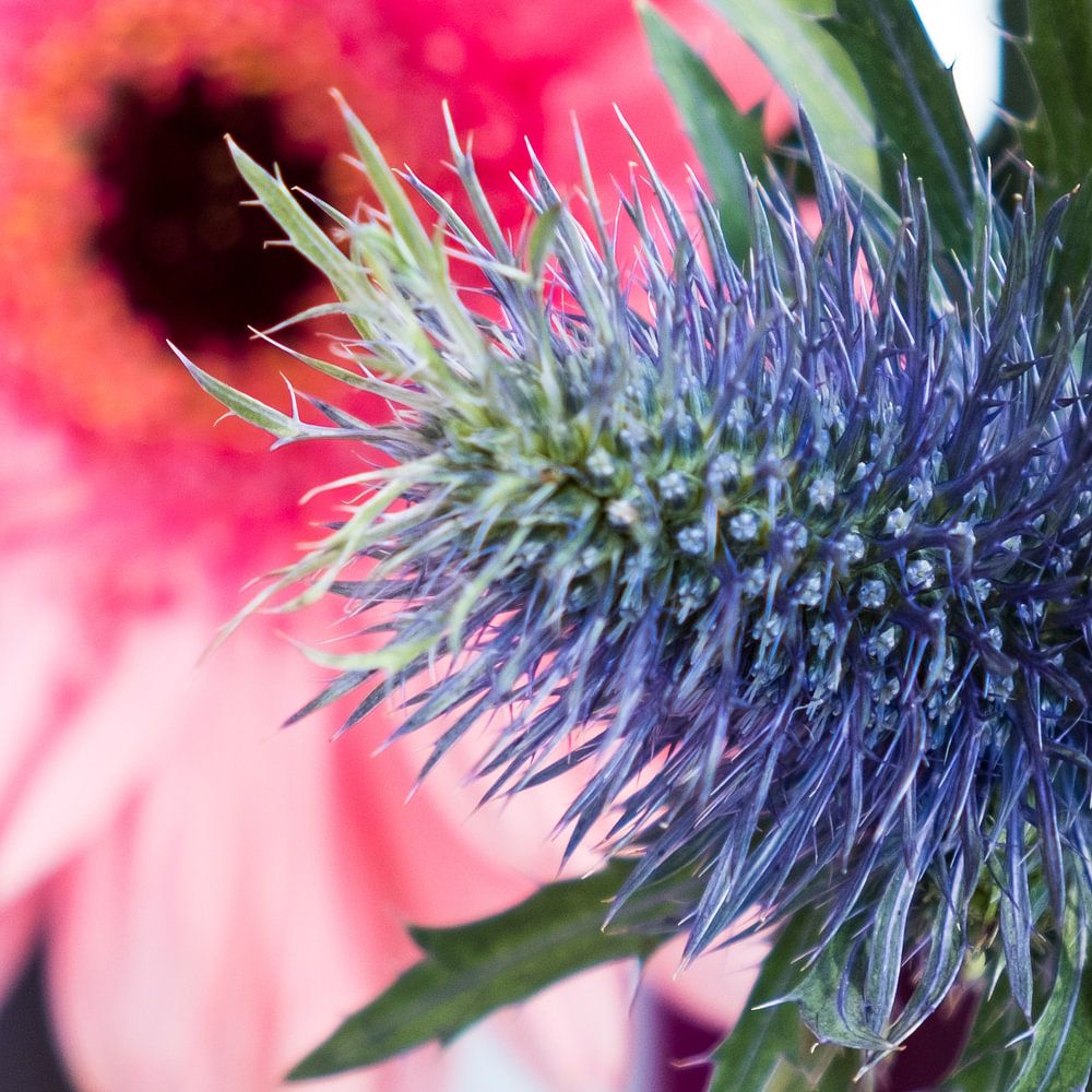 Buy this flower art combination of purple thistle for pink flowers up close by Idema Media on canvas, ArtFrame, poster and wallpaper, printed on demand in high quality.