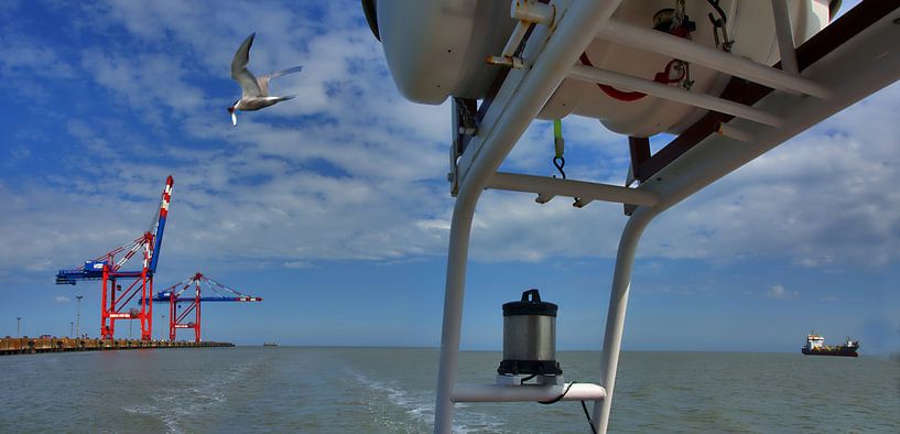 Port cranes and container ship at the Jade Weser Port near Wilhelmshaven at the Jadebusen from the ship as panorama photo with a seagull with a fish in her beak