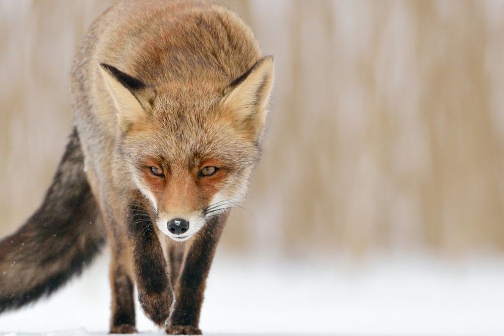 The frontal encounter with the fox is given a special tension by the low perspective of the shot. The sly look and the raised front paw do the rest.