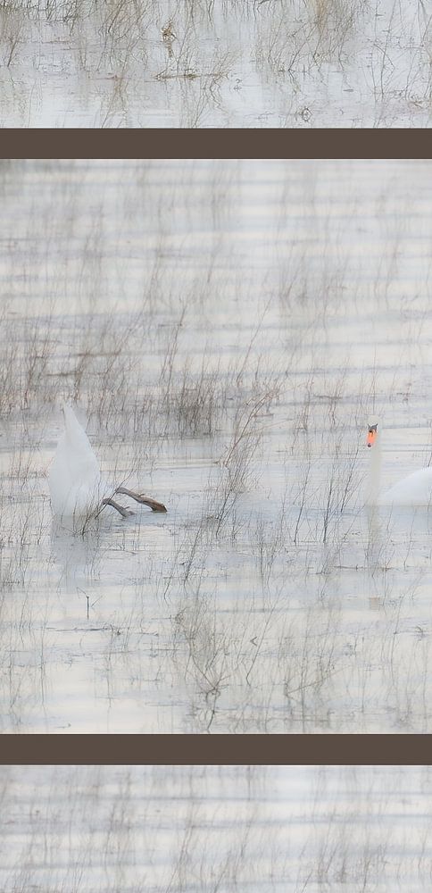 In Millingerwaard, I saw these swans diving fanatically for food. It was in winter at high tide, so there were all sorts of bare stalks just above the water. That, together with a breeze, created an almost graphic representation of the swans' surroundings. I spent some time watching and photographing, which resulted in this series.