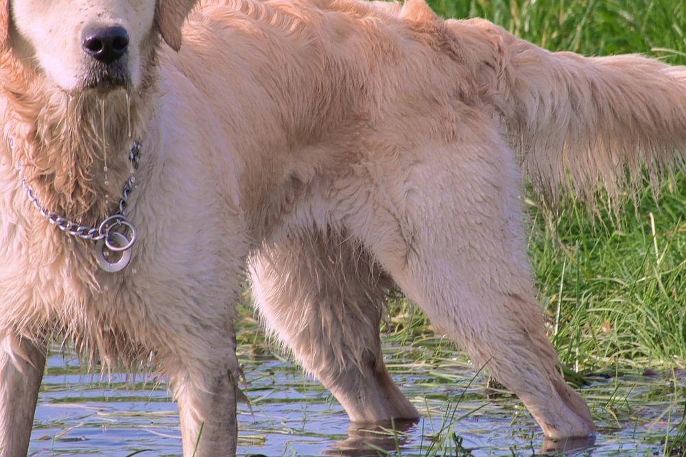 This sweet golden retriever loves to play is water puddles and mud puddles.