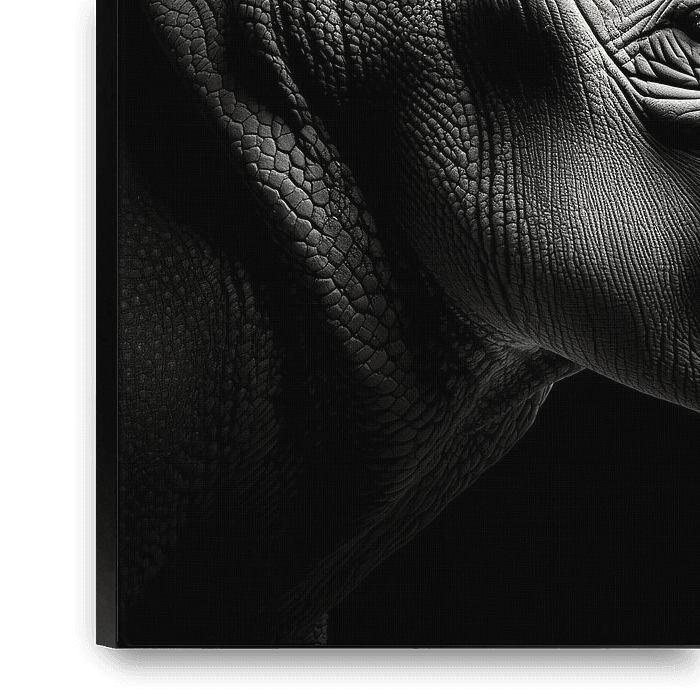 dramatic black and white portrait photo rendering of a rhino's head seen from the side against black background with top and front lighting.