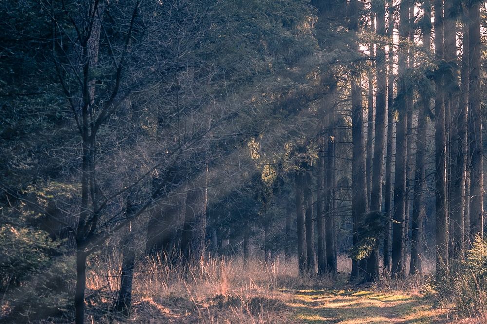 sunbeams through the trees. the path is beautifully lit. fairy colors