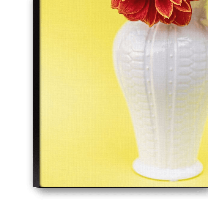 large dahlia flowers in various shades of red, orange and yellow in an old-fashioned white belly vase against a yellow background