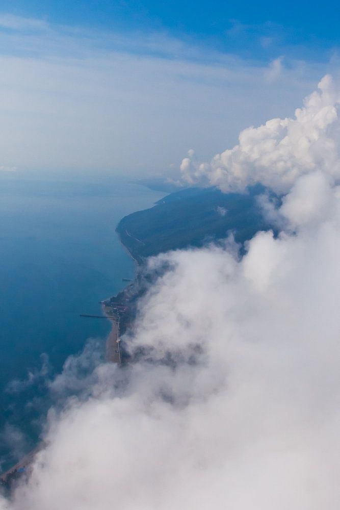 high flight against the wall of clouds over the blue sea view of a paraglider pilot, summer vacation by Michael Semenov