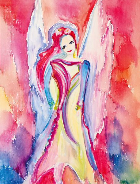 This expressive watercolour depicts a delicate, luminous angelic figure set against a palette that is both vibrant and gentle. The figure appears calm, introspective and full of grace – as if floating in a quiet moment between heaven and earth. Her flowing, reddish-pink hair blends harmoniously with the luminous colours of her robe,…