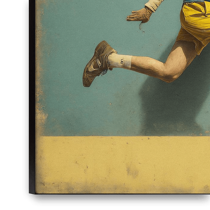 we see an elderly man on the padel court. he has a blue shirt and yellow shorts. Man has a grey beard. The style of the image has a painterly, vintage and slightly faded look, as if it is a combination of photography and art