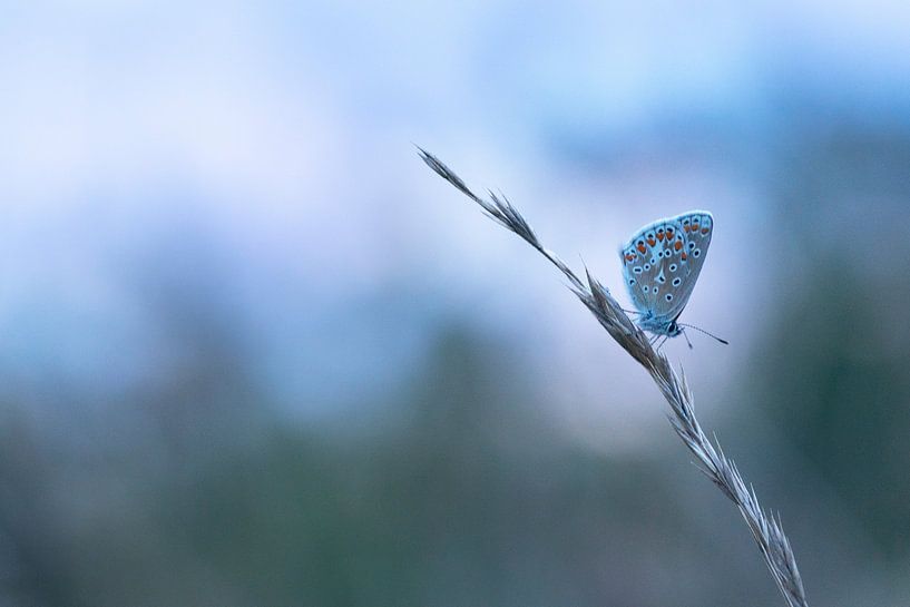 Buy this landscape artwork minimalist butterfly in blue light by Bianca Blonk on canvas, ArtFrame, poster and wallpaper, printed on demand in high quality.