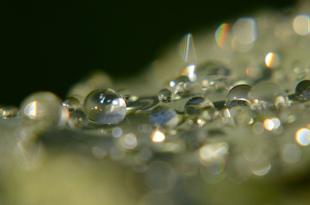 Prachtige druppels van de nachtvorst die op een blad van een plant liggen en door de zon liggen te schitteren.