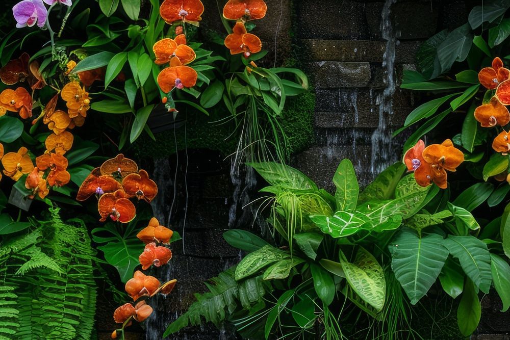 Tropical background wall with exotic plants and exotic flowers.Computer generated image.Digital creation.