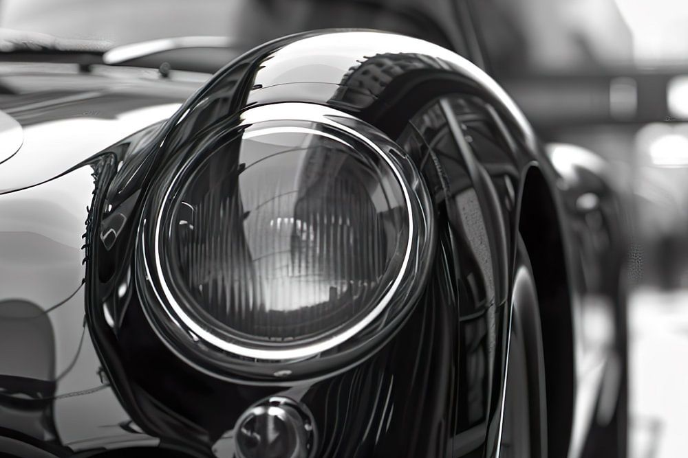 The black-and-white photo shows an old Porsche, elegant and timeless. The classic lines of the bodywork stand out sharply, while the shiny chrome accents add a subtle shimmer. The round headlights and iconic emblem exude nostalgia, with a background of weathered asphalt adding to the vintage charm.