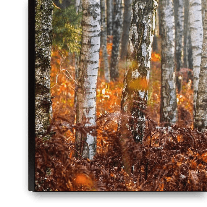 a cool morning, birch forest in autumn, the sunlight lets the autumn colours shine, at the edge of a nature reserve in the Dübener Heide, the enchanting atmosphere is enhanced by a double exposure