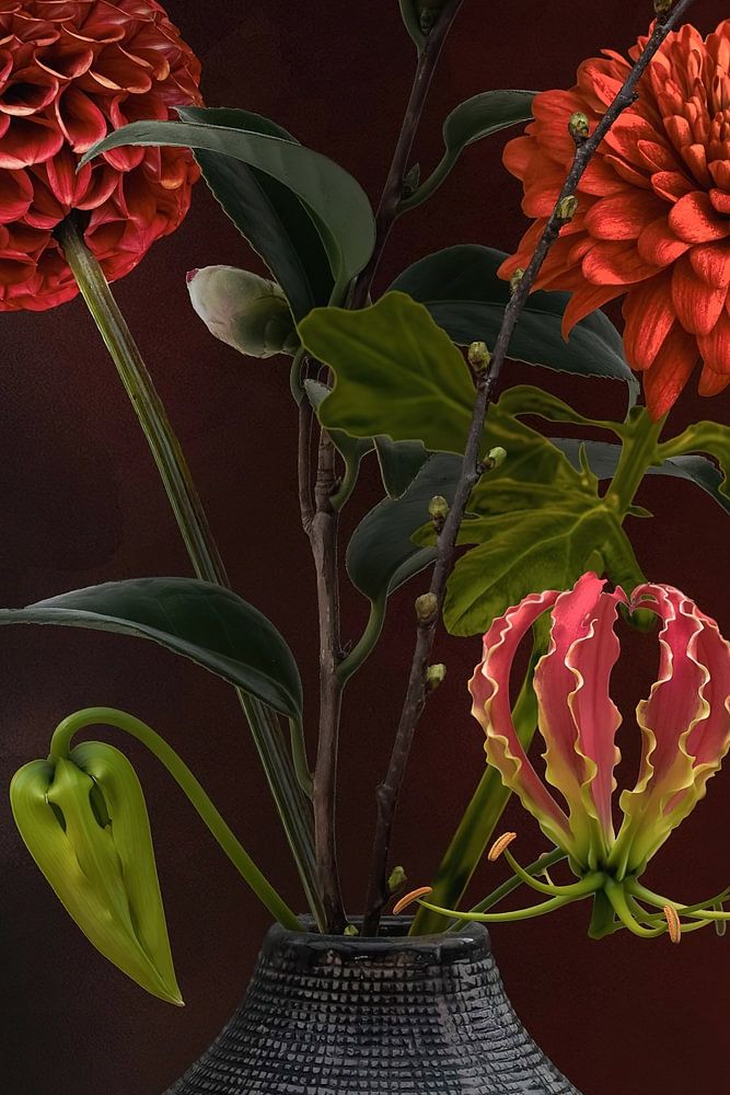 Dahlias, Gloriosa Rothchildiana and camellia.