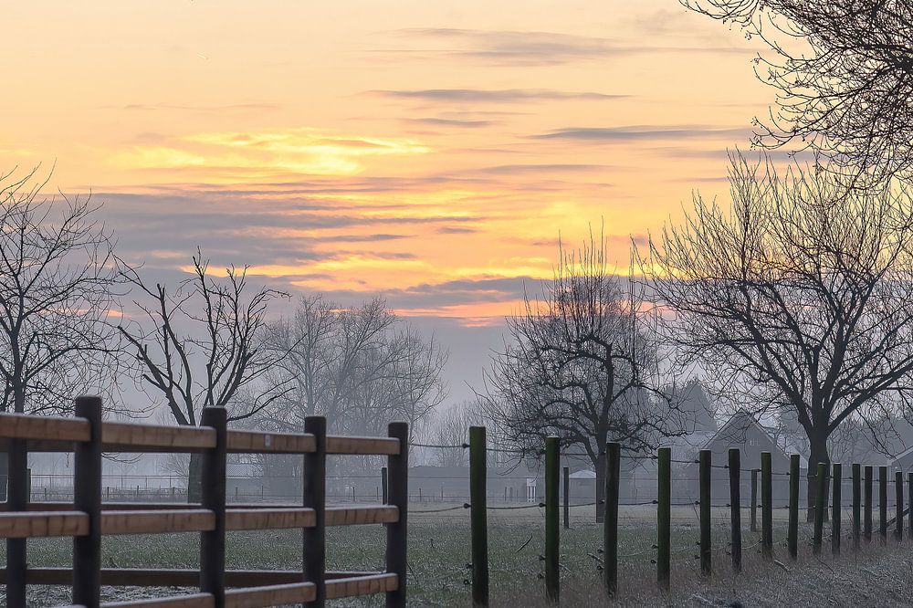 landscape in Homoet, Gelderland, where you see fenced off meadows, trees and a ditch, under a beautiful orange sky during the winter