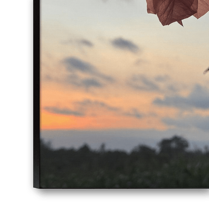 Delicate bougainvillea flowers are captured in silhouette against a radiant sunset. The soft evening light shines through the petals, revealing their delicate details, while the horizon fades into soothing shades of orange, pink and blue. This composition combines the beauty of tropical flora with the serenity of a calm sunset.