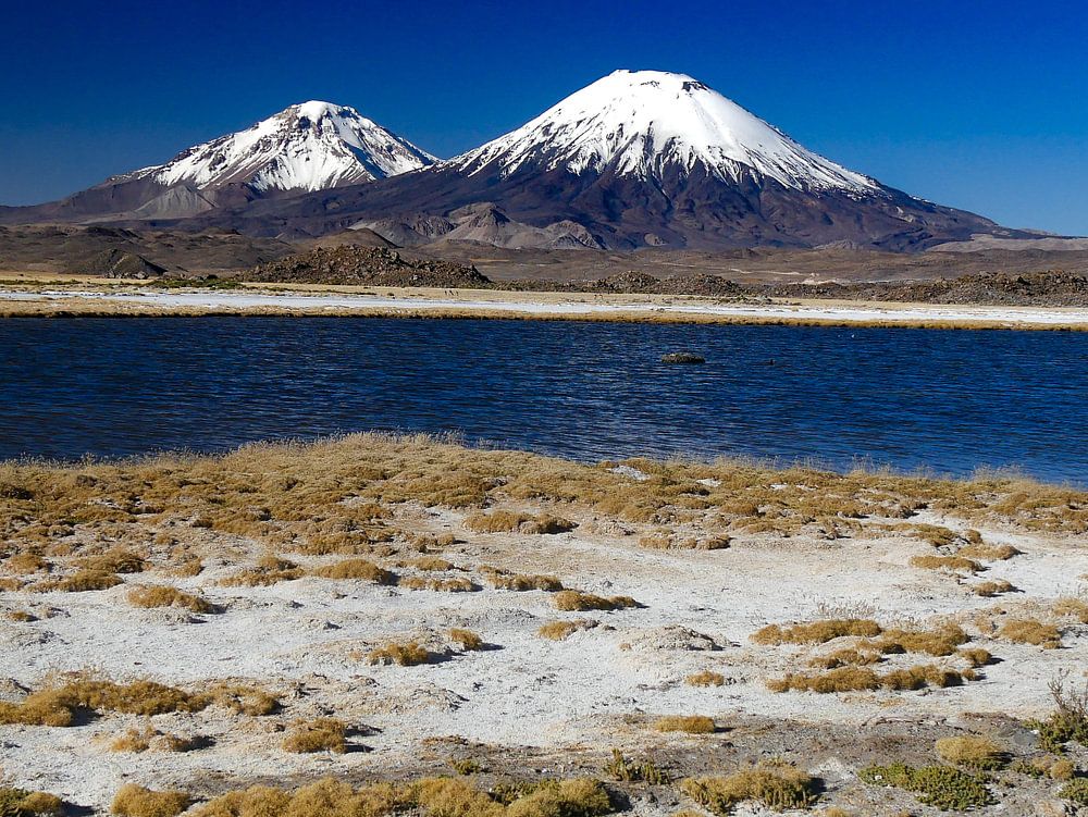 de bekende Parinacota vulkaan die op de grens staat van Chili en Bolivia. deze strato vulkaan is 6348 meter hoog. met een prachtig helder blauw meer op de voorgrond en zijn zusje de pomerape vulkaan.