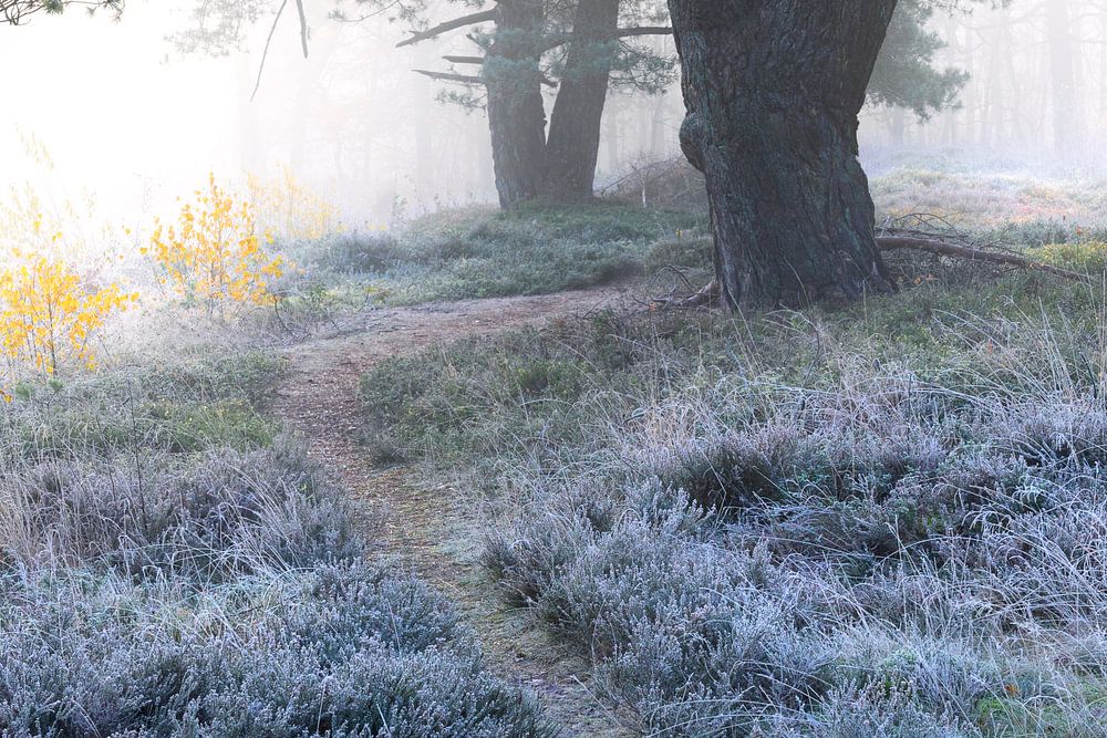 path between trees at frosty cold autumn sunrise by Olha Rohulya