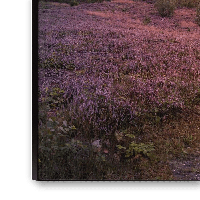 A picture of flowering purple heather just before sunset. The thin cloud veil ensures that the sunlight is filtered. To get as much as possible of this place on the photo, this photo is a panorama, made up of 8 vertical photos.