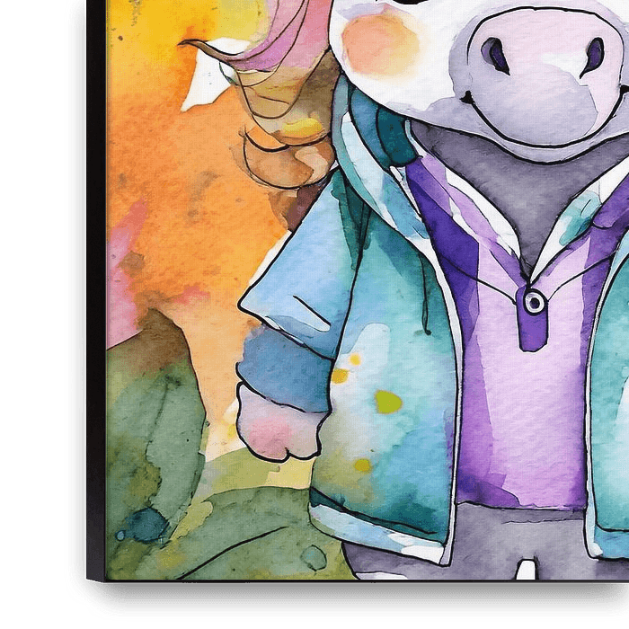 The image created by Ai shows a beautiful scene of a colourful young unicorn foal, captured in vibrant hues reminiscent of a soft watercolour technique. The unicorn foal exudes youthful energy and has a lovely look that is perfect for a child's room.