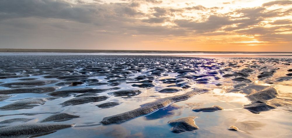 Beach at Burg Haamstede during low tide and sunset. The structures of the dried-up beach are beautifully highlighted by the sun that has just set