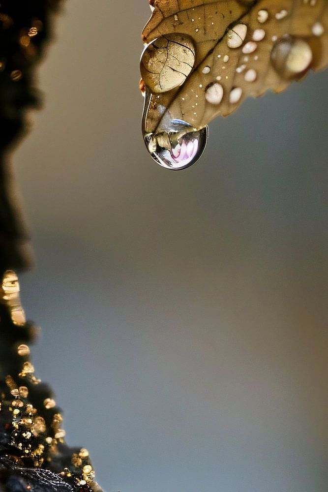 This understated artwork captures a fleeting moment of beauty in nature. A dewdrop, full of the world's reflection, hangs from the tip of a leaf. The leaf, scarred by time, provides a natural frame for this small miracle. The soft, earthy colours and the contrast between the delicate leaf and the rough background create a sense of harmony and tranquillity. This artwork is a reminder of the beauty that can be found in the smallest details of life.