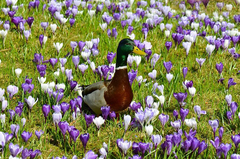 In the middle of a blooming crocus meadow, a duck stands enjoying the first warm days of the year. The bright green and purple flowers create a lively, almost fairy-tale-like spring atmosphere full of tranquillity and natural beauty.