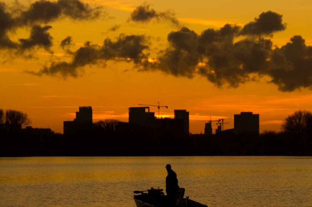 Buy this of Rotterdam sunset on the lake silhouette of a boat by Alain Ulmer on canvas, ArtFrame, poster and wallpaper, printed on demand in high quality.