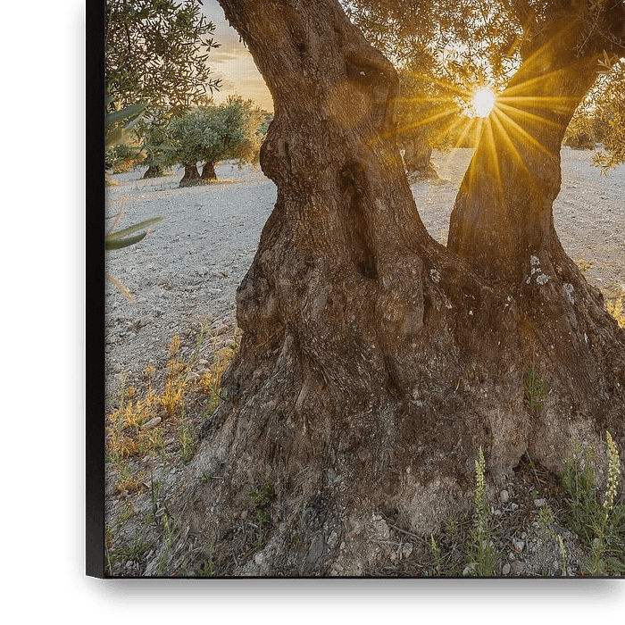 Sunset seen among olive trees with a vista. The photo was taken at one of the many olive groves in central Spain near Madrid.