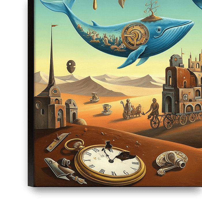 Buy this landscape artwork surrealism flying whales in the desert by Jan Bechtum on canvas, ArtFrame, poster and wallpaper, printed on demand in high quality.