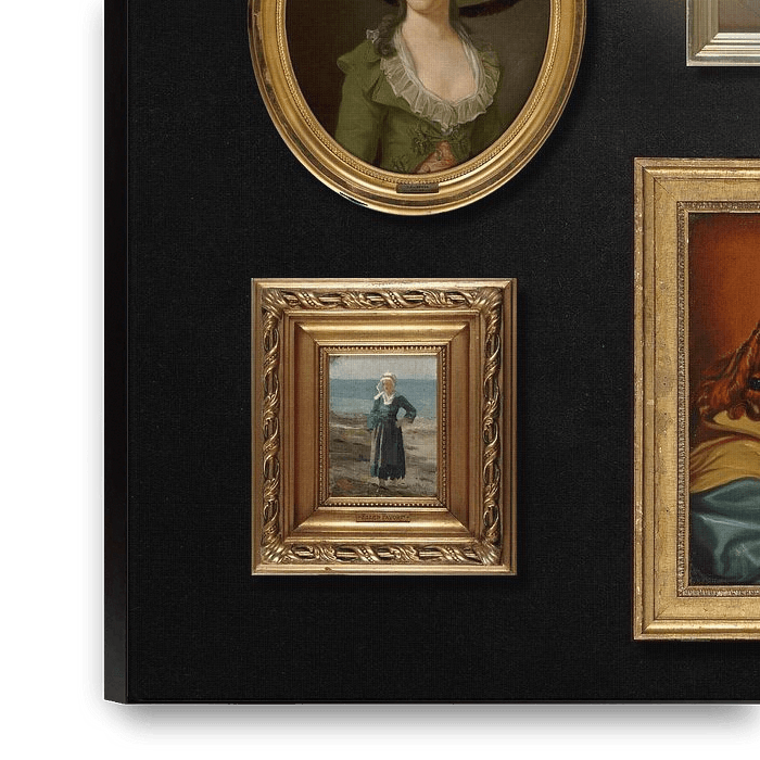 This digitally produced collage offers an intriguing collection of eight classic artworks, presented in a trompe l'oeil style. Trompe l'oeil (French for "trick of sight") is a technique that creates three-dimensional effects on a flat surface, making it appear as if the framed paintings are actually physically hanging on a black…