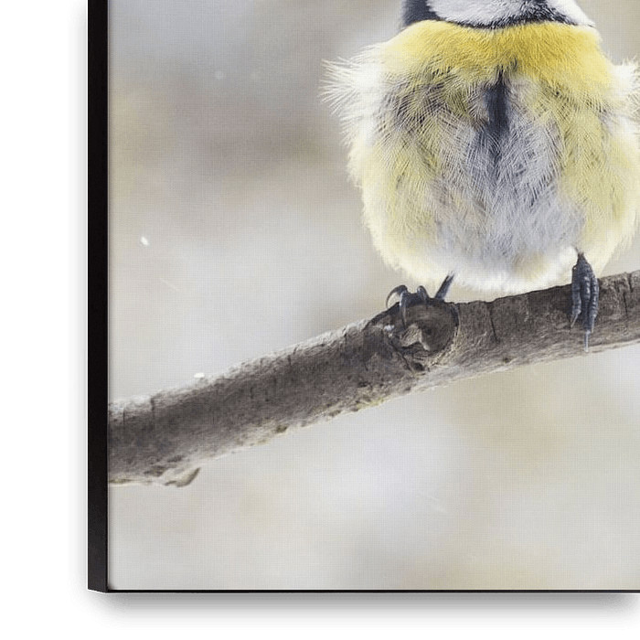 Buy this bird art three eurasian blue tits (Cyanistes caeruleus) sitting together on a branch in the wind, the small p by Maren Winter on canvas, ArtFrame, poster and wallpaper, printed on demand in high quality.