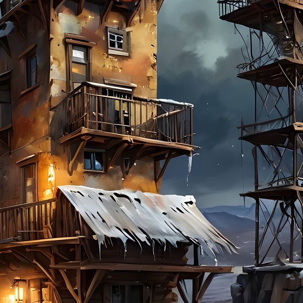 mysterious tower-like buildings in the wild west, winter, evening mood, steampunk