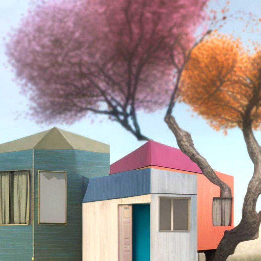 Three imaginative tree houses in different shapes and colours stand in the middle of a gentle, undulating landscape under a serene sky. The houses in turquoise, white and orange seem to rest on stylised tree trunks, surrounded by trees with pink and orange leaves. Small, bushy plants line the ground. The scene appears dreamy and playful, an idyllic depiction of unusual dwellings in a peaceful, imaginary world. The clear colours and simple composition create a cheerful atmosphere.