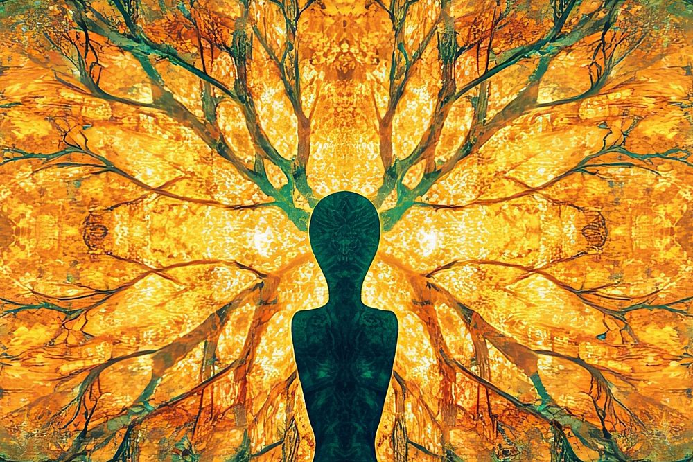 digital spiritual meditative fictional painting depicting man in nature