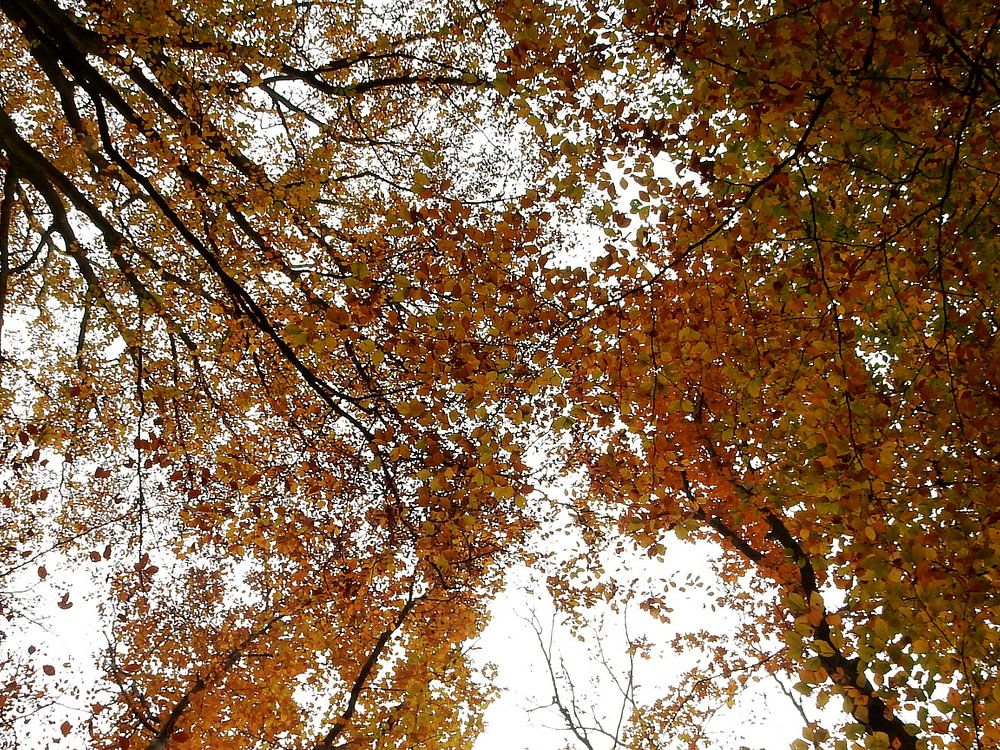 looking from bottom to top at the treetops in autumn colours