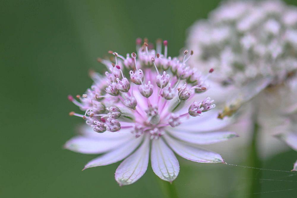 close up of the astrantia, or Zeeland knot, with the emphasis on three flowers, and a green background