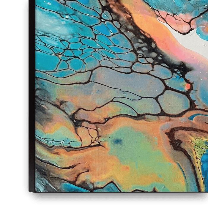 An abstract acrylpouring painting. I called it turquoise waters because the colors remind me of a beautiful clear sea with coral reefs in all kinds of shapes.