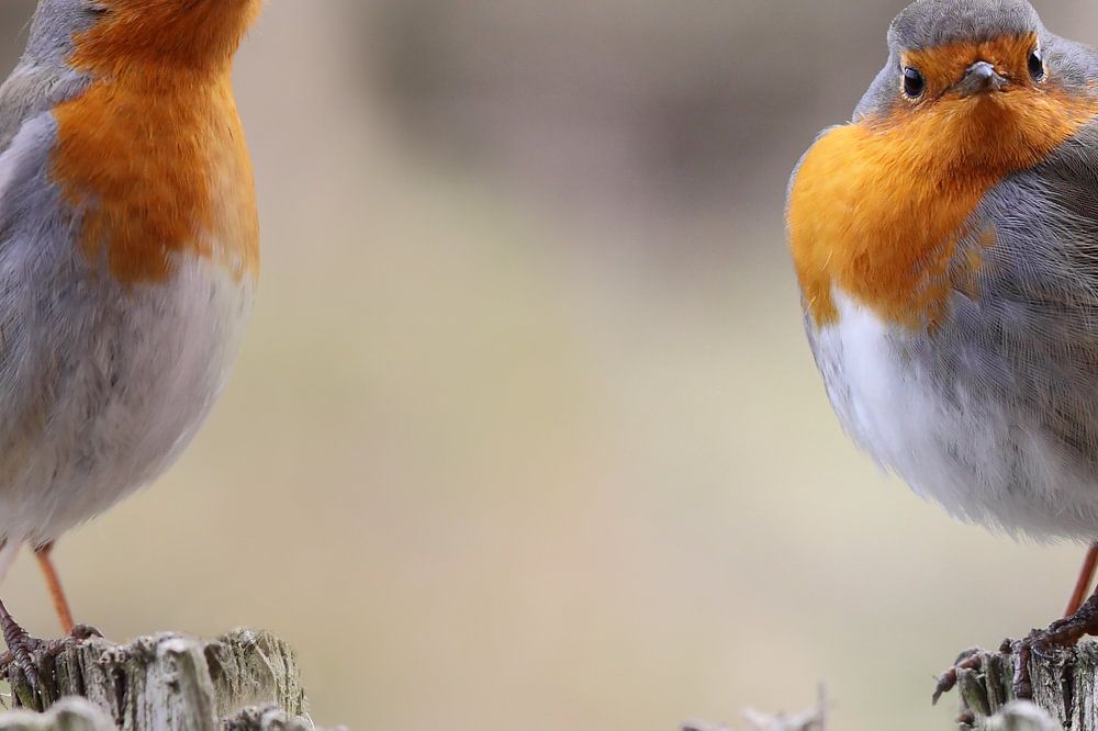 Two robins on a tree stump. One has fluffed while the other robins cranes his neck.