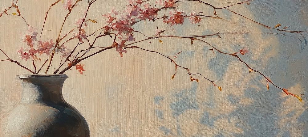 vase flowers | Quiet Blossom Vase - This flower painting shows a modern still life with a pottery vase and slender branches with pale pink blossoms in soft side light that casts long, soft shadows on the wall, an atmospheric still life with flowers and perfect as a flower painting or painting flowers for a modern interior.