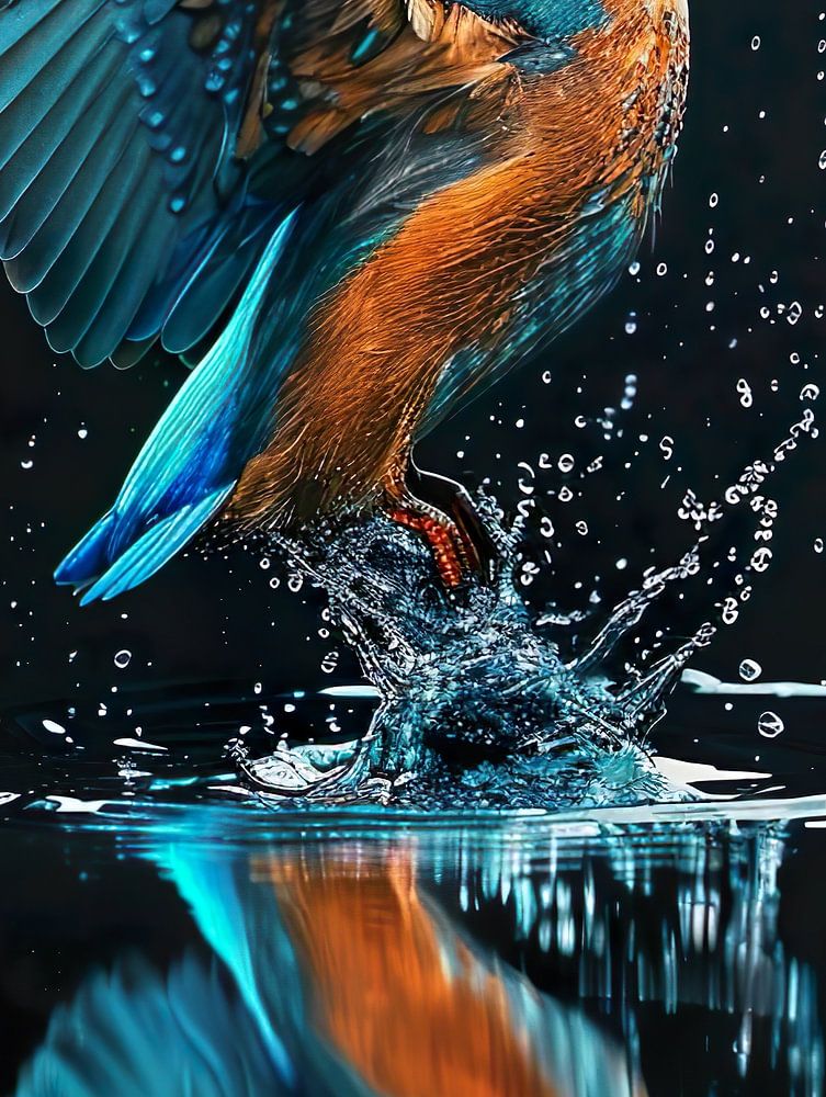 A vibrant kingfisher rises from the water, spreading its brilliant wings. Drops splash from its bright blue and orange feathers, glistening in the sunlight. Holding a fish firmly in its sharp beak, it rushes upwards, eyes full of focus. The air seems to vibrate with his energy.