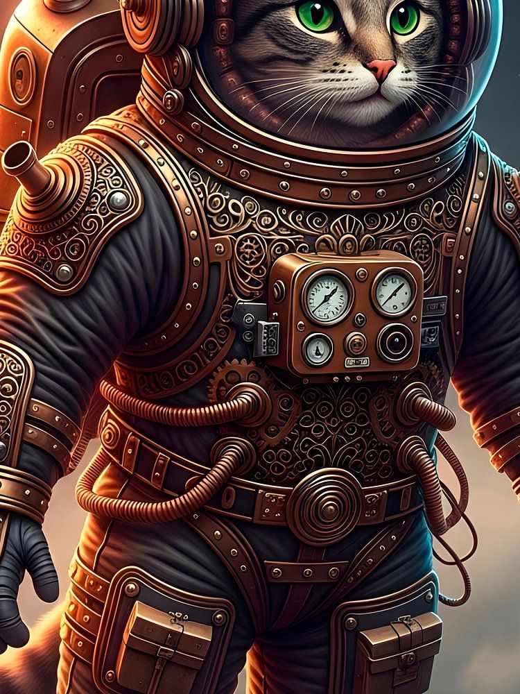 About "whimsical Cat explorer in a magnificent steampunk space suit navigates"
