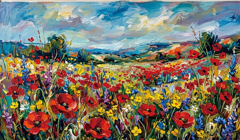 a colorful and energetic natural landscape, depicting a vast expanse of wildflower fields under a dynamic sky