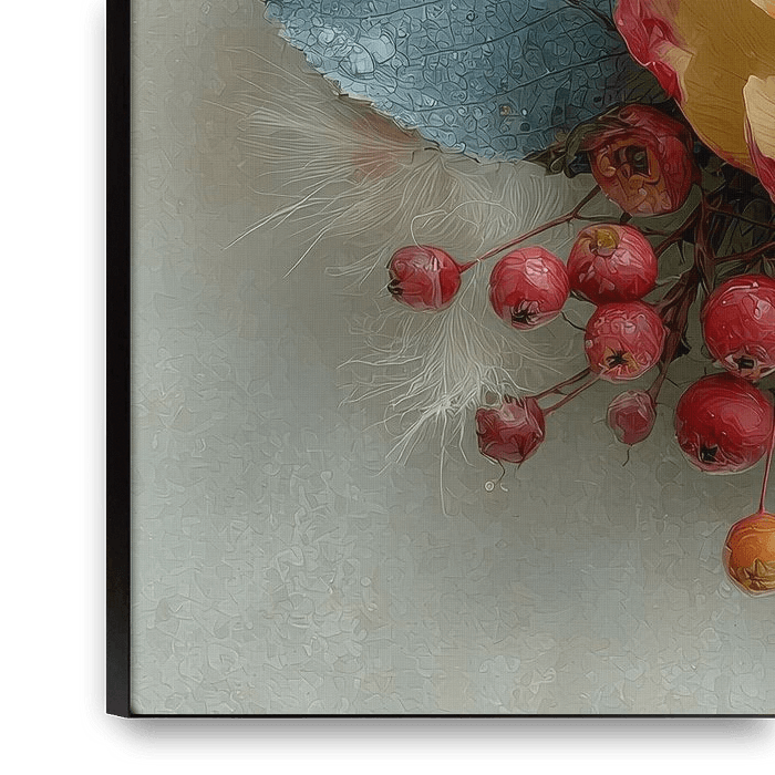 Een collectie van unieke fine‑art afbeeldingen, telkens gebaseerd op hetzelfde thema: gele bloemen met parelende waterdruppels en lichte ijsvorming op de blaadjes, gecombineerd met bessen, bladeren en veren in wisselende samenstellingen.