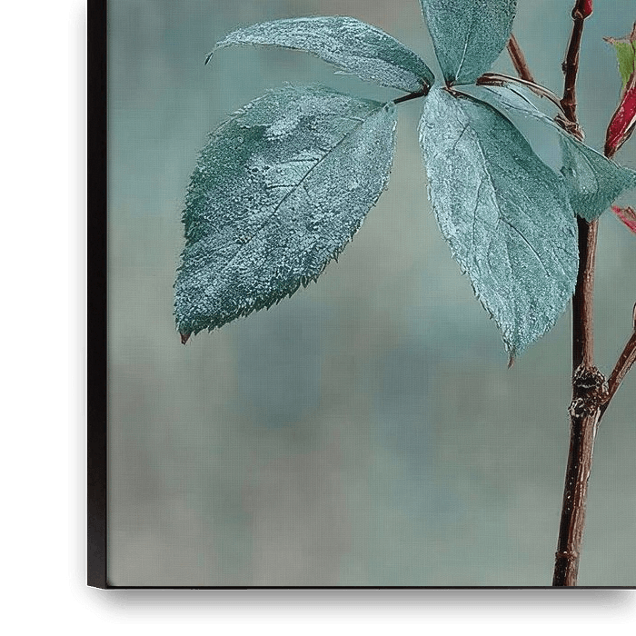 Een collectie van unieke fine‑art afbeeldingen, telkens gebaseerd op hetzelfde thema: gele bloemen met parelende waterdruppels en lichte ijsvorming op de blaadjes, gecombineerd met bessen, bladeren en veren in wisselende samenstellingen.