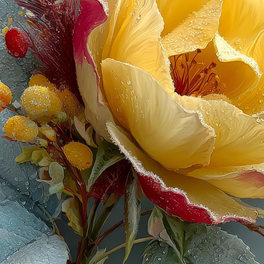 De gele bloemen stralen warmte en optimisme uit; de waterdruppels vangen licht en geven tactiele diepte; subtiele ijsrandjes voegen een frisse, bijna magische spanning toe.