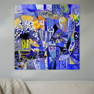 Modern abstract botanical art. Flowers and plants in pink, blue and grey by Dina Dankers