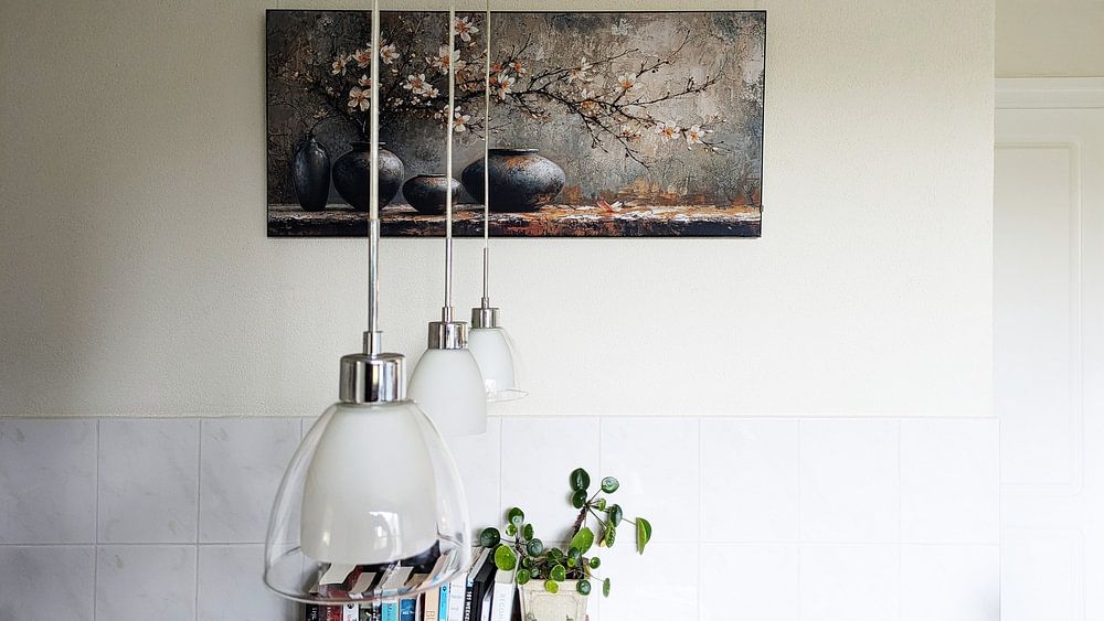 Still life artworks bring calm to everyday spaces. The serene composition in Elegant Still life painting: Vase with almond blossom suits rooms where you want a peaceful atmosphere - think bedrooms, reading corners, or dining areas. Hang it at eye level where you can appreciate the detail without distraction.