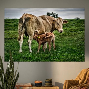 Looking for cosy cow paintings? Buy cheerful and colourful cow canvas prints here, or soothing photo prints of cows in the meadow. This beautiful rural wall art is versatile and can be combined with any interior and style. Country photography and cow paintings can be purchased from us on a customised basis and on high-quality materials. Think of impressive wallpaper with cows in the barn, or colourful cow paintings on acoustic panels to reduce the reverberation in your home.